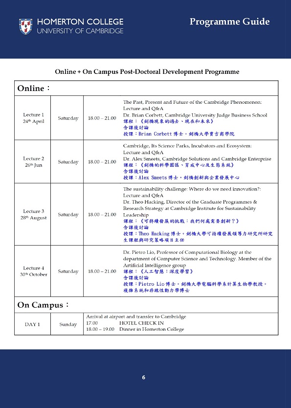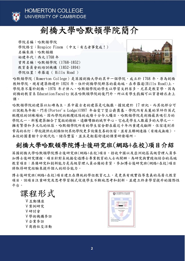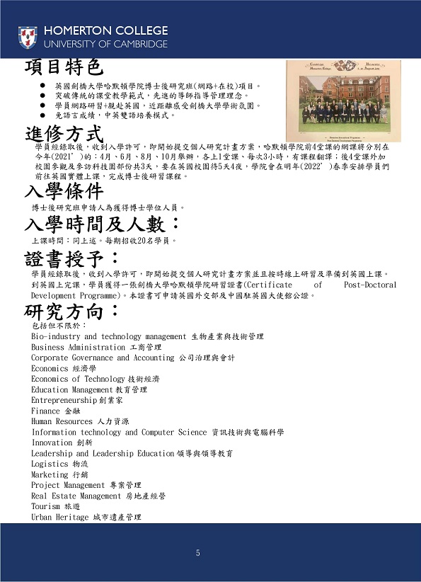 英國劍橋大學哈默頓學院 博士後研究班